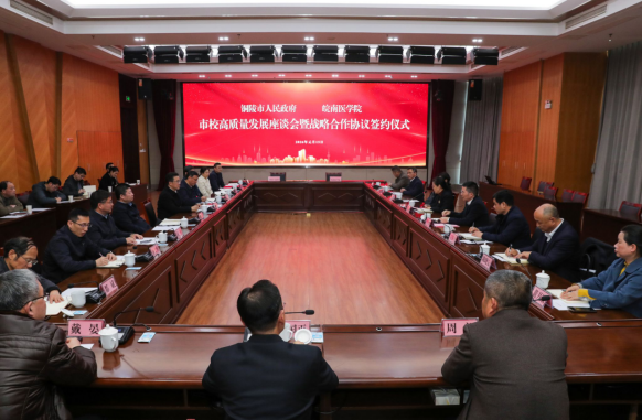 杨宏星代表市委、市政府向夏劲松、姚应水一行的到来表示诚挚欢迎,向皖南医学院长期以来对铜陵发展的关心支持表示衷心感谢。他指出,皖南医学院实力雄厚,建校以来为全省乃至全国卫生健康事业发展作出了重要贡献。近年来,市校双方在多个领域开展了一系列务实合作,结下了深厚情谊,结出了丰硕成果。希望双方以此次签约为新起点,进一步拓展合作领域,丰富合作内涵,在人才共育、科研共推、医疗共促等方面深耕细作,扎实推进医疗卫生等基本公共服务均等化,引导人民群众科学就医、合理用药,努力让广大群众广泛受益、困难群众深度受益,携手共建健康铜陵,助推健康安徽建设。铜陵市将一如既往做好服务保障,推动合作事项落地见效,不断谱写市校合作新篇章。